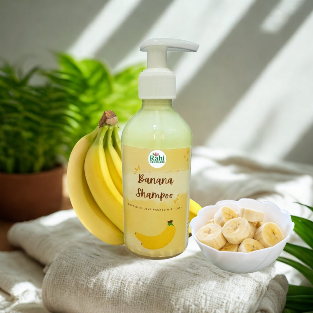 Our Banana shampoo has real Banana extract which offers several benefits for hair, including improved hydration, strength, and shine. The nutrients in bananas, like potassium and vitamins, can help nourish the scalp, promote hair growth, and reduce frizz. It also help strengthen hair strands, reducing breakage and brittleness. It also protect hair from environmental damage and improve scalp health.